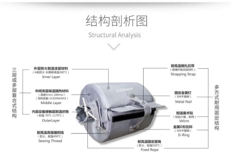 科好特可拆卸保溫套(衣)一般由三層或多層材料構(gòu)成,每一層的材料都有其重要的作用。針對不同的保溫需求,會制定不同的材料方案。