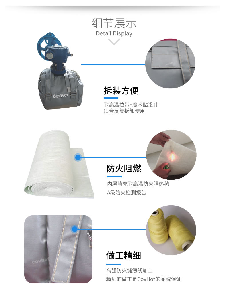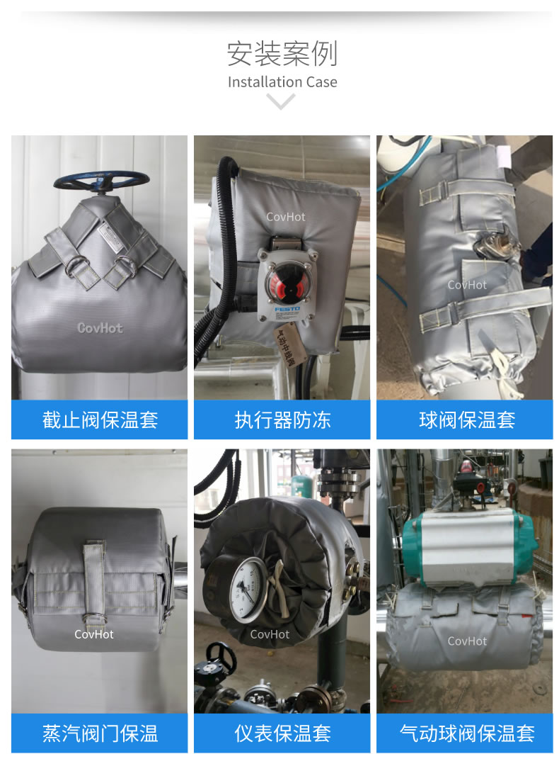 冬季來臨時要檢查、經(jīng)常排污,防止包裝的保溫材料破損??刹鹦兜y閥門保溫套采用耐高低溫、防火保溫材料;有內(nèi)襯、中間保溫層、外保護層三層組成;根據(jù)管道或設備的具體形狀及其使用環(huán)境,經(jīng)過精心設計、測繪后,通過特殊工藝制作而成。而傳統(tǒng)的保溫產(chǎn)品在每次檢修時會損壞,只能一次性使用。